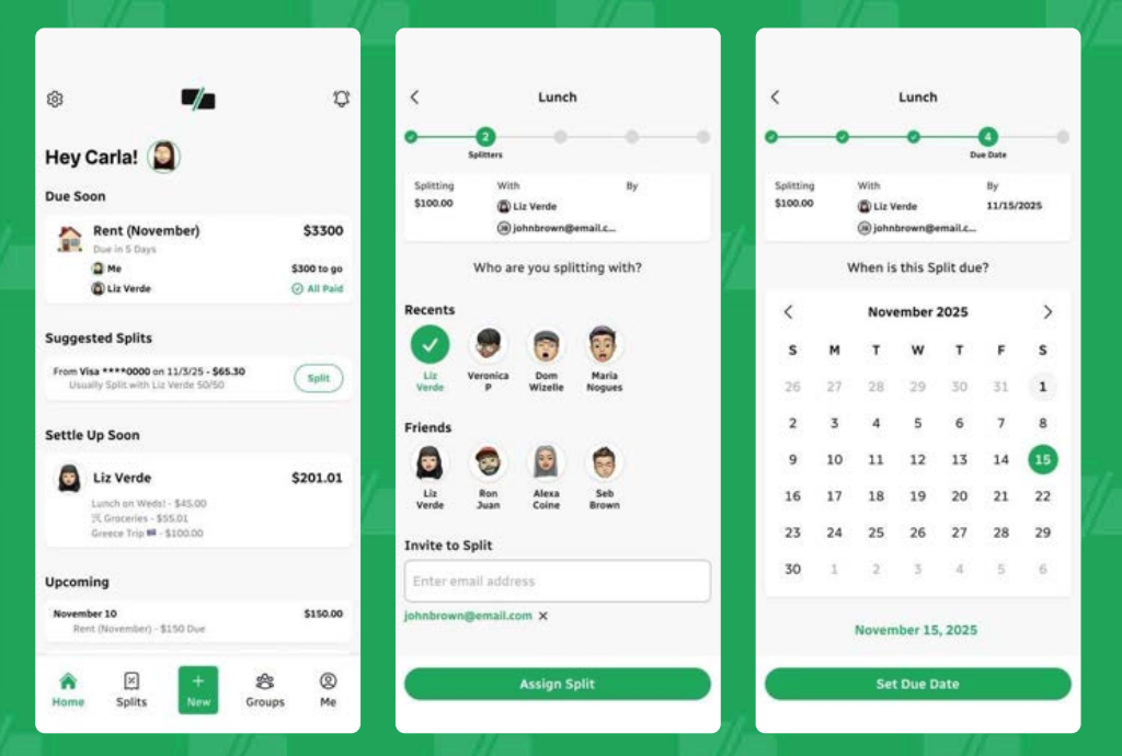 His final capstone project—a budget-sharing mobile app—became a standout piece that let him stretch creatively in ways his day-to-day work doesn't always allow. He intentionally chose a prompt that pushed him outside his typical design approach, giving him room to explore a more consumer-focused, mobile-first product. He conducted research, mapped out flows, fleshing out multiple screens and weaving in the visual techniques explored throughout the course.