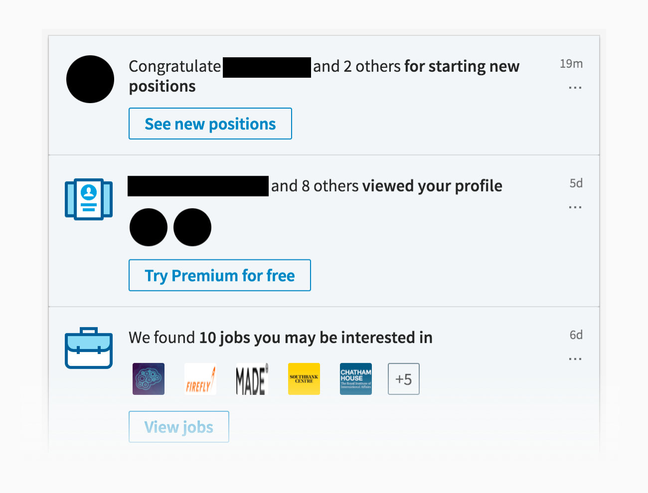 But when I click to see these notifications, they turn out to be nothing of the sort. Instead, I’m served with pseudo-notifications encouraging me to 1) engage with changes in other people’s profiles, 2) sign up to their Premium service by promising to show me who’s been looking at my profile, and 3) browse job ads.