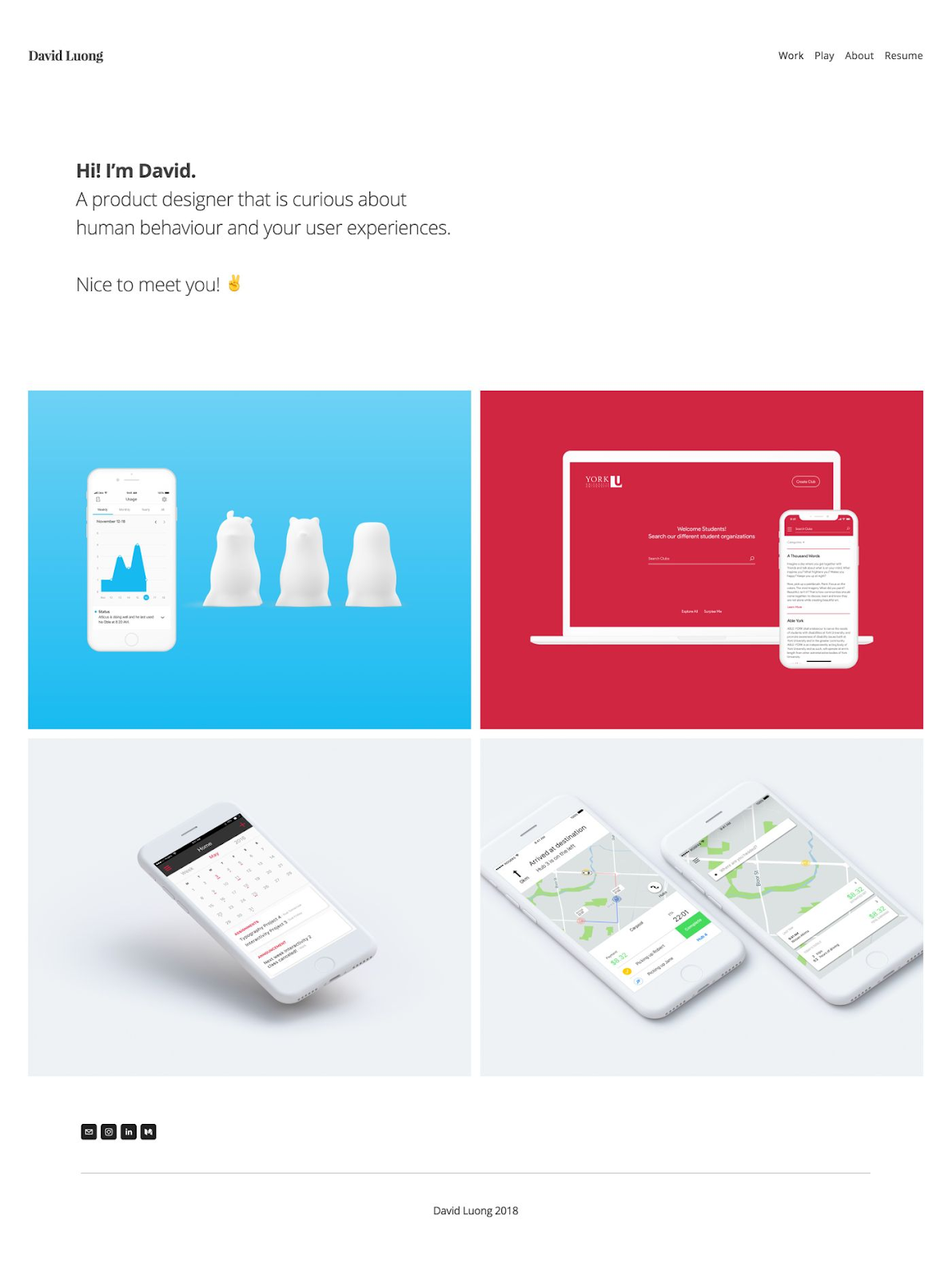 Yet another approach is to avoid photography altogether. 2019’s UI design trends are very much about simple, flat interfaces, and you can still build a stunning portfolio without any photographic content. David Luong’s is a great example of how to do this well: