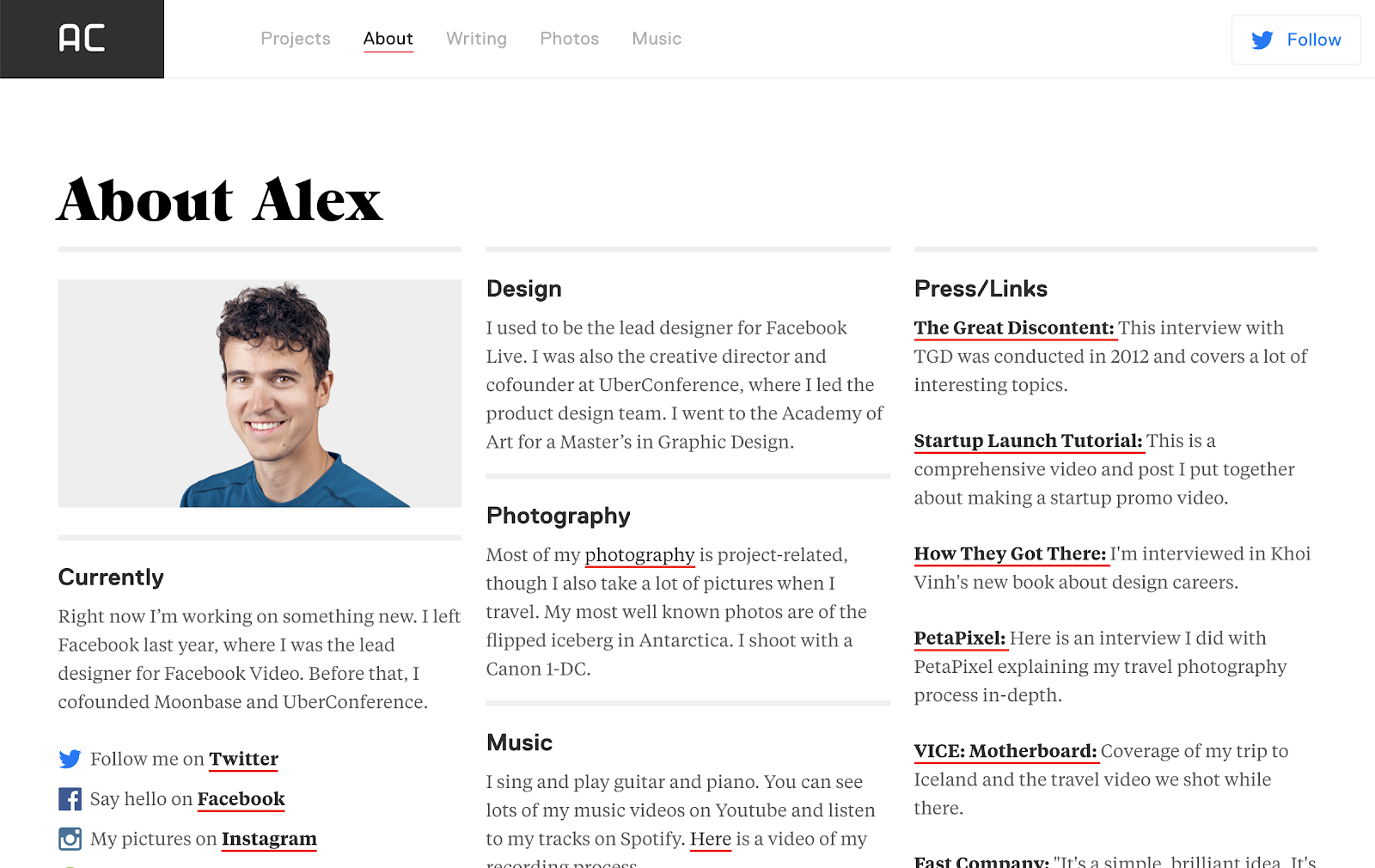 Instead, either avoid including a photo of yourself at all (particularly if you’re actively applying for roles, since many hiring managers in organizations with fair recruitment policies will want to avoid seeing photos of candidates), or include a tasteful, professional shot on your About page. Alex Cornell does this perfectly: