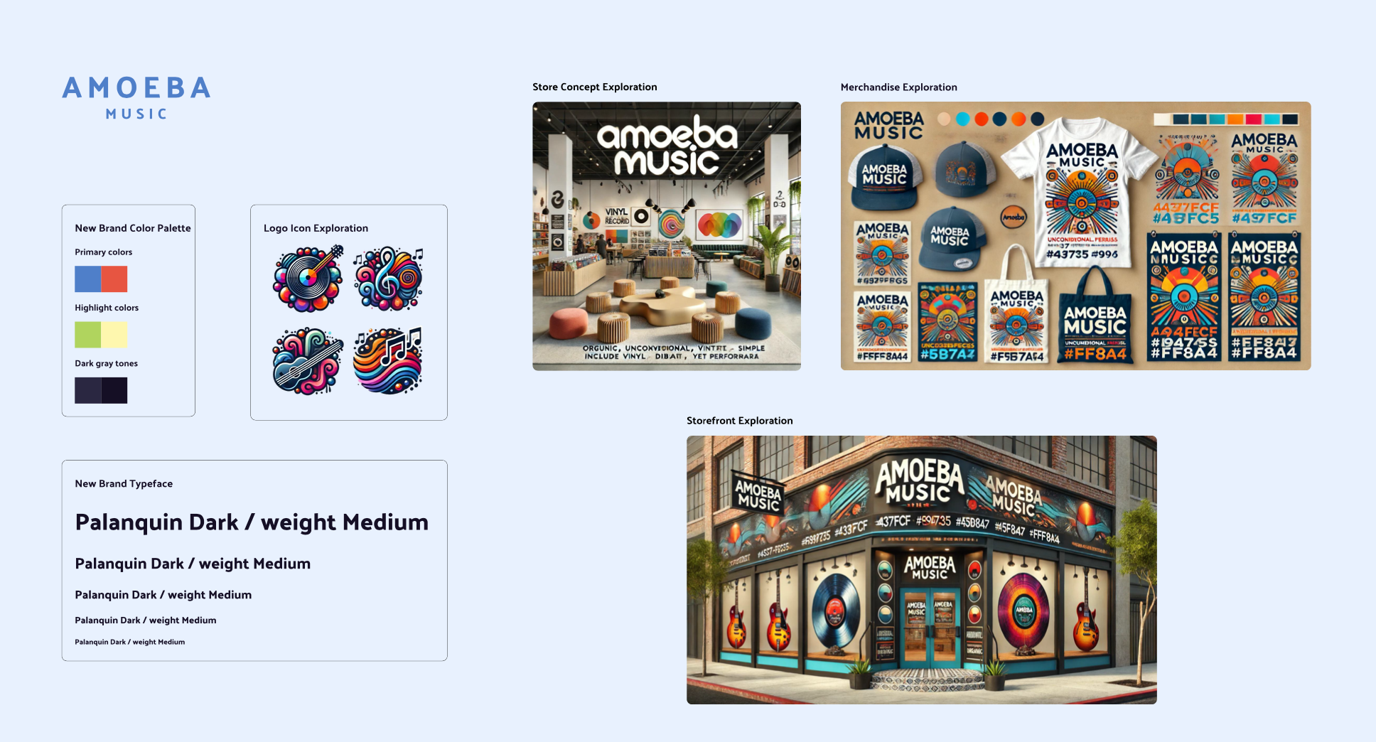 In AI for Visual Design, students work on reworking an existing company's brand, for which Rob chose legendary record store Amoeba Music.