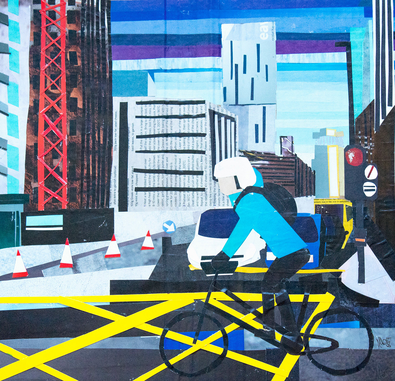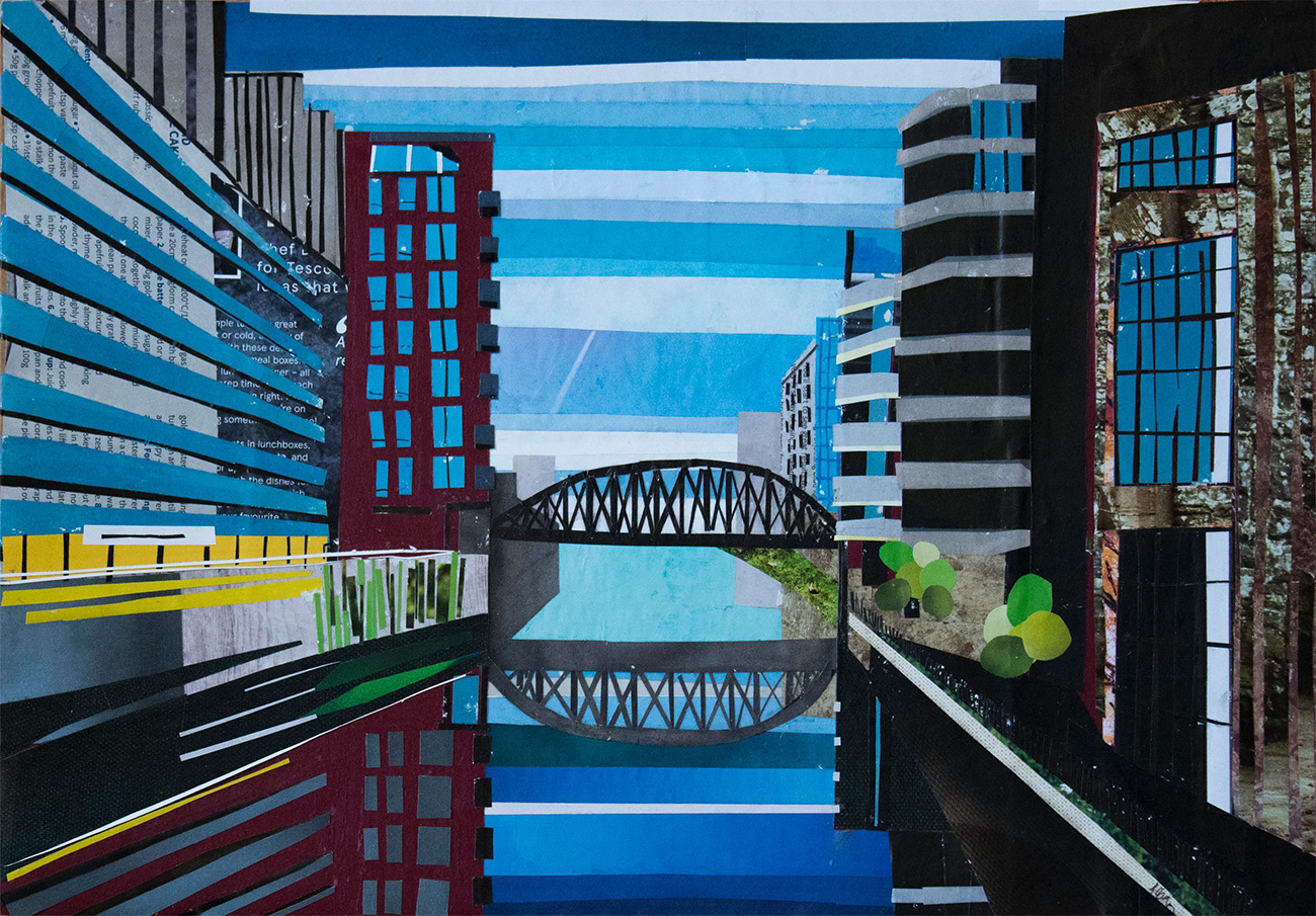 I take a lot of photos with my phone, so I have a bank of pictures documenting the city. When I want to start a collage, I look through them and find the one that most excites me. I dive straight in, using a photograph as the model.