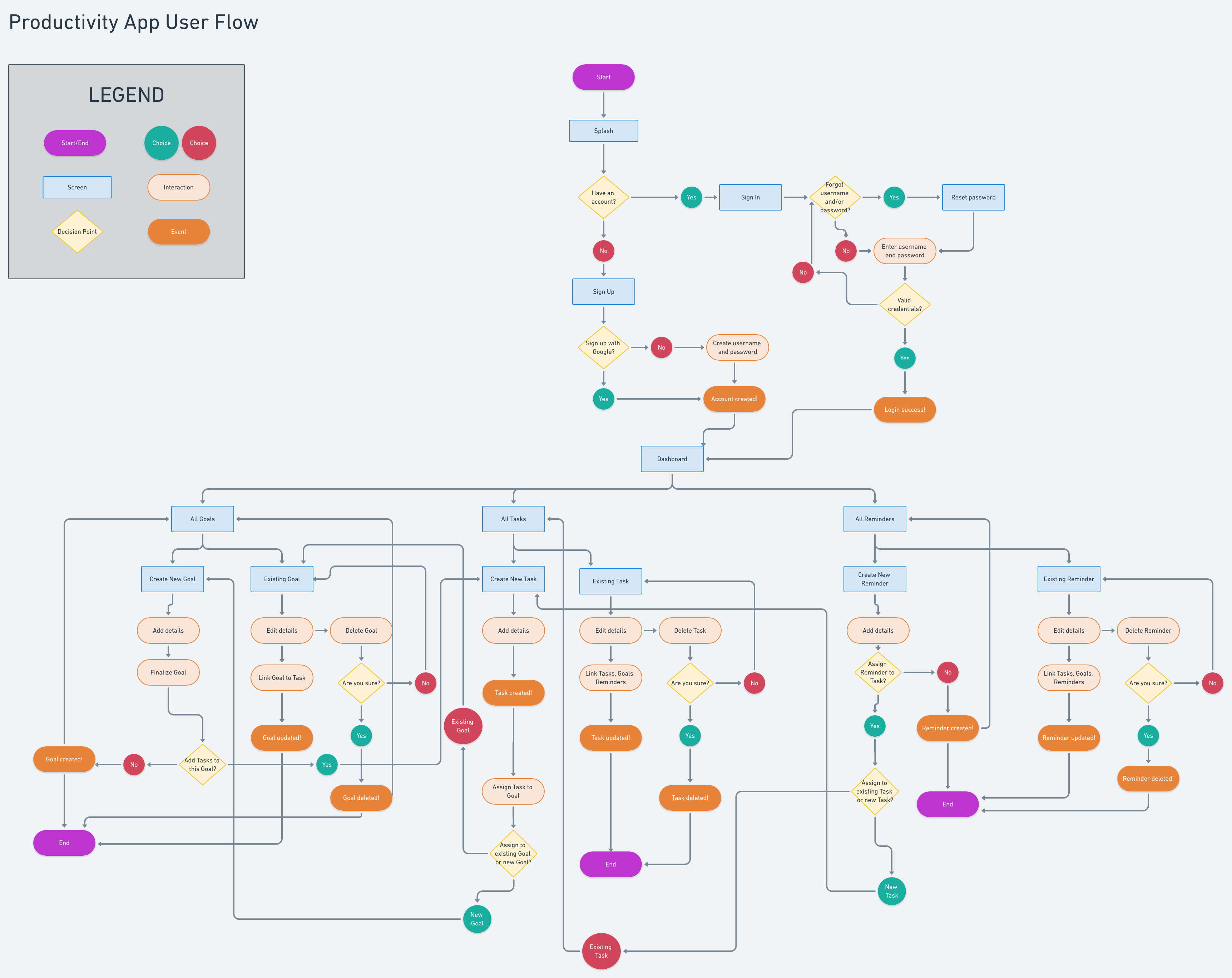 User flow for Goalful, a productivity app design.