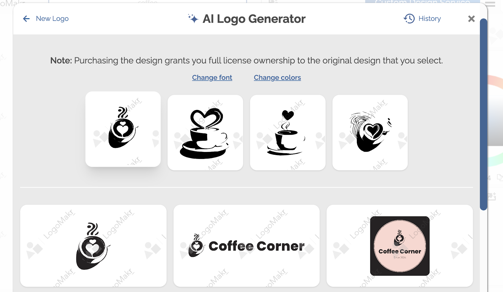 This one is very cool. LogoMakr offers a lot of freedom and customization options for more experienced creators but also provides guidelines and prompts in their AI generator.