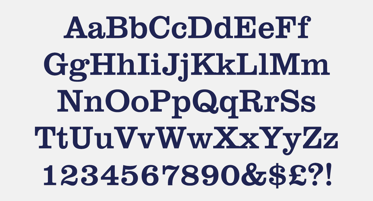 Clarendon is an example of a “slab serif” typeface, which had emerged as a genre of type design in the early 1800s. Modern slab serifs are usually characterized by blocky, square serifs, a relatively bold overall appearance, and low or no stroke contrast (the difference in width between thick and thin parts of a letter).